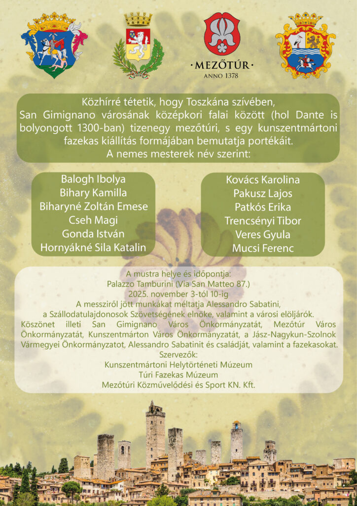 Megtiszteltetés és nagy öröm számunkra, hogy San Gimignano város galériájában mutathatjuk be Mezőtúr és Kunszentmárton fazekasmestereinek kerámiáit.