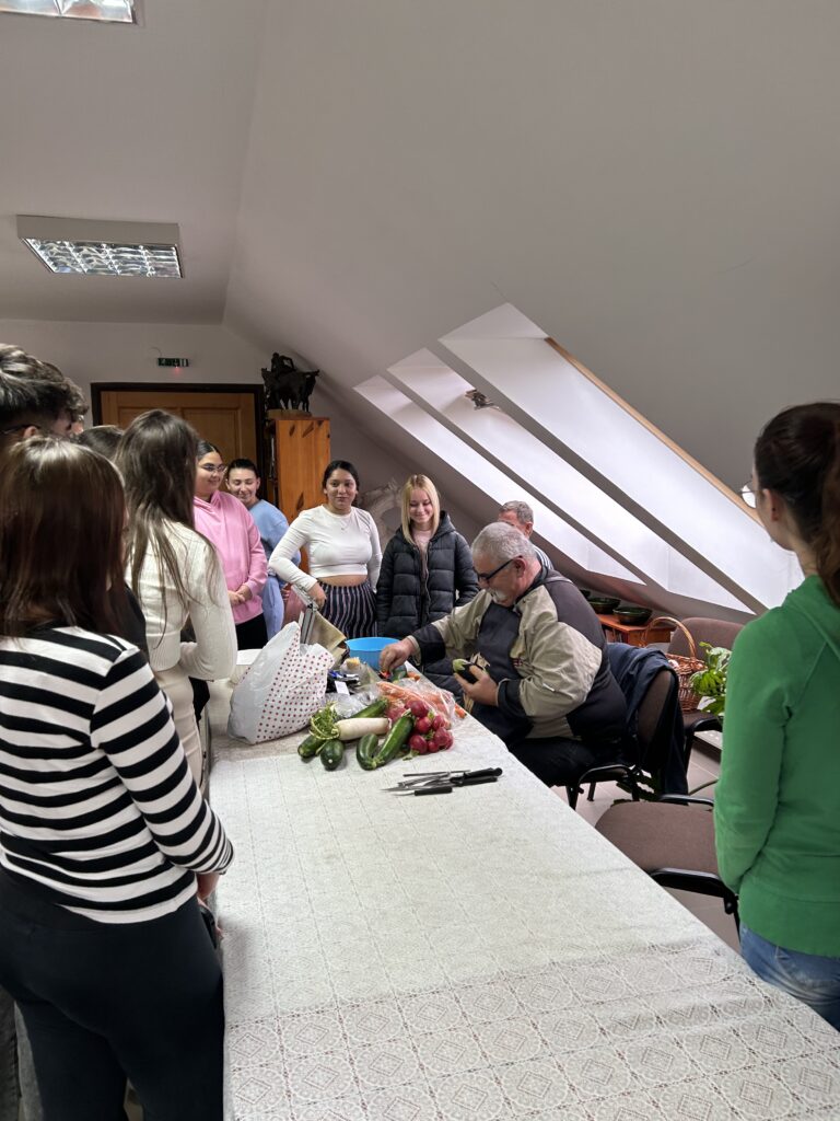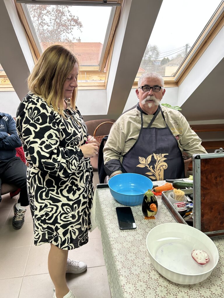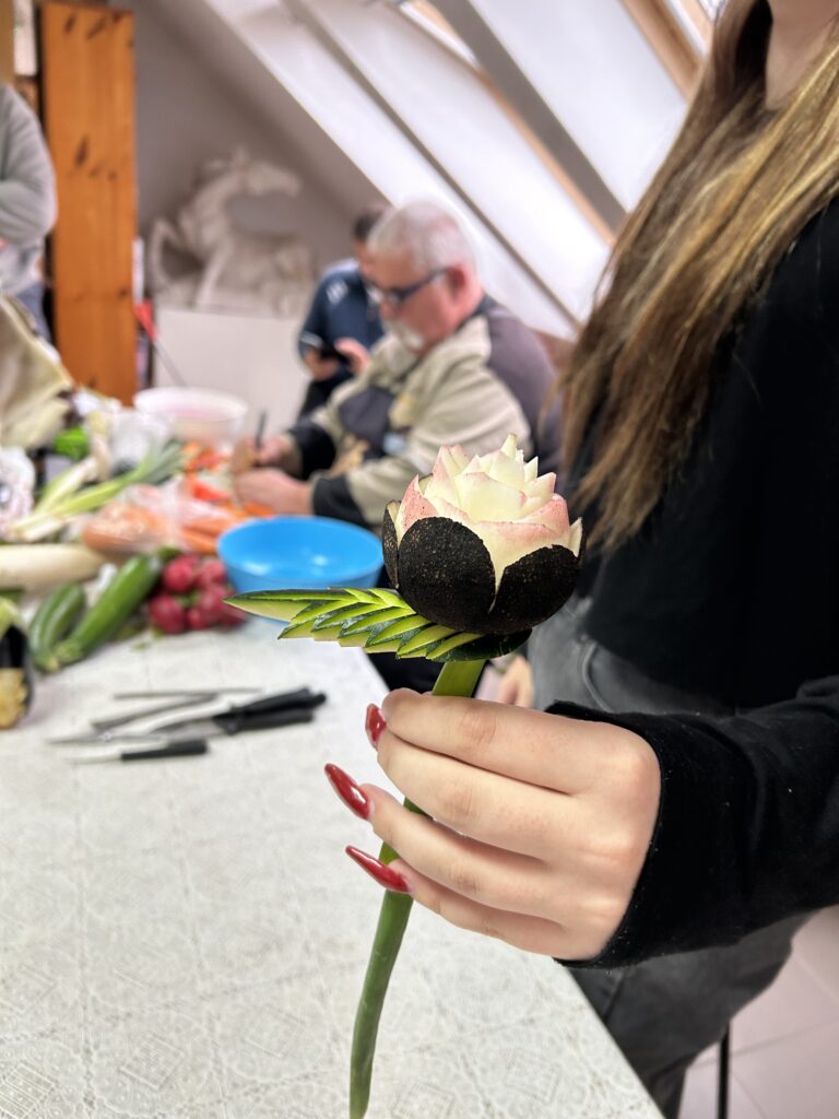 Rácz Lajos séf az egészséges alapanyagokról, zöldségekről mesélt, majd zöldségdekorációk készítéséről tartott bemutatót, melyet nagyon élveztek a diákok.