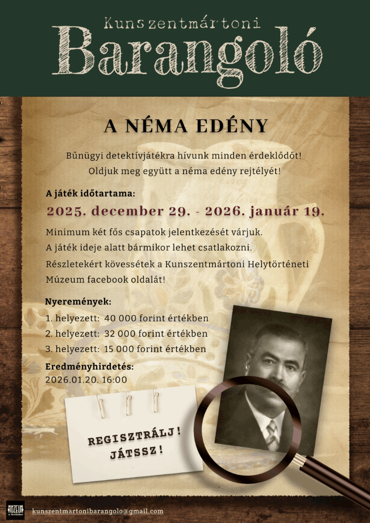 Idén sem maradhat el a Kunszentmártoni Barangoló nyomozós múzeumi játékunk! A játék időszaka: 2025. december 29. 12:00 – 2026. január 19. 12:00.Eredményhirdetés: 2026. január 20. 16:00 Facebook poszt közzétételével.Díjátadó: 2026. január 22. 16:00 Múzeum Kávézó. További részletekért kövessétek a múzeum Facebook oldalát, vagy a játék eseményét!